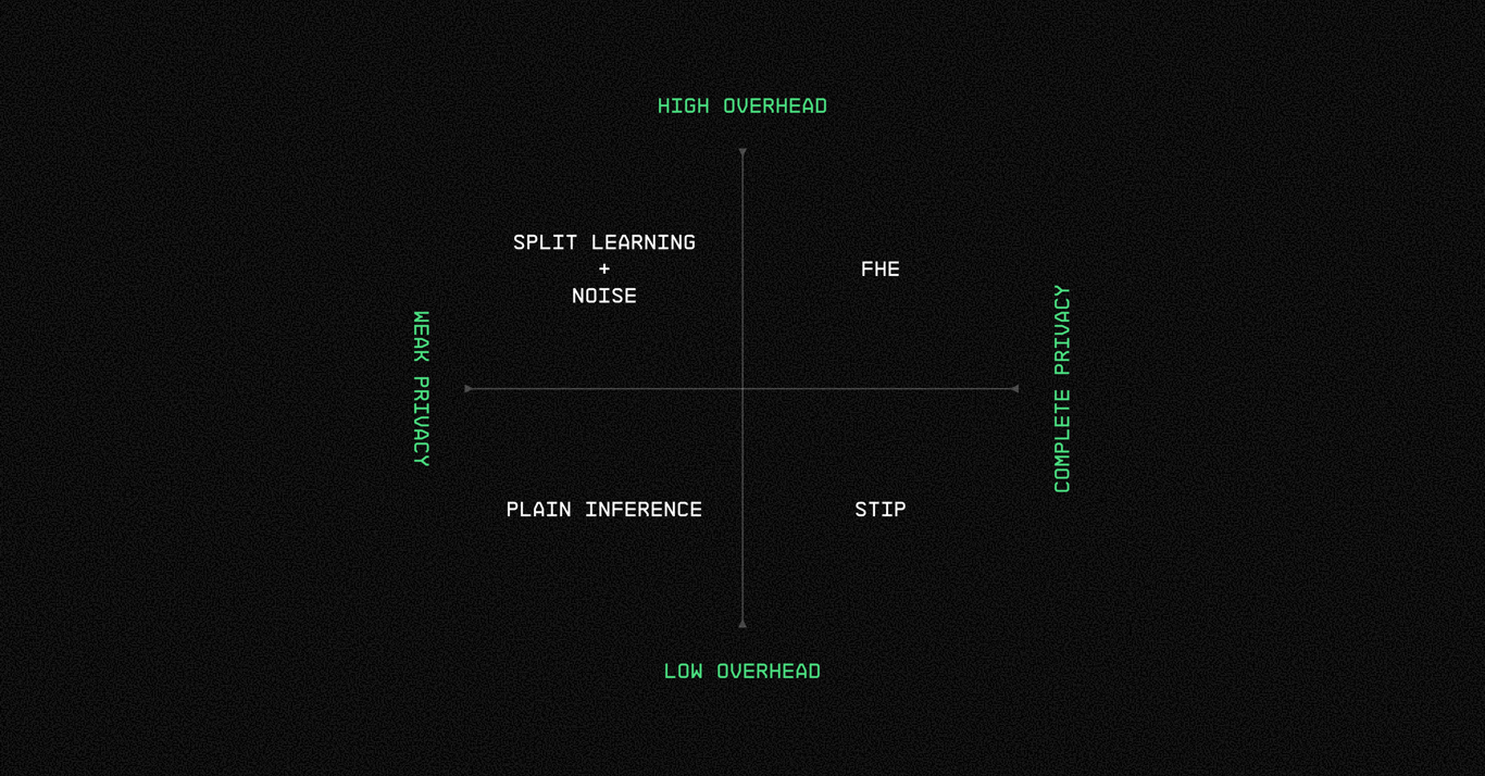 Split-model approaches address efficiency by partitioning inference between local and remote compute to prevent raw inputs from ever leaving the user’s local device (Gupta & Raskar, 2018). Intermediate activations, however, contain information that make them vulnerable to input recovery attacks, limiting pure split-based data privacy (Shu et al., 2025).