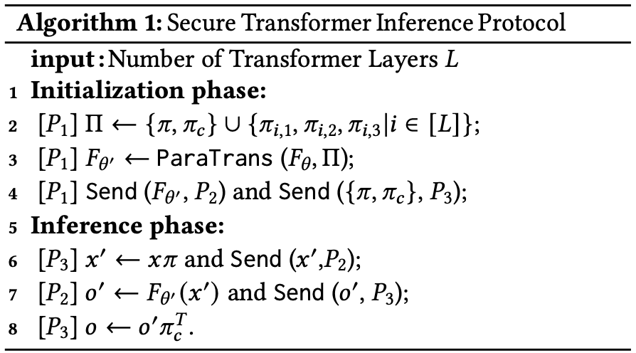The entire transformer function is transformed into where . As such, when the client receives the output , it can re-permute it back to by multiplying with .