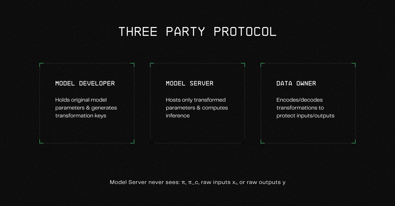 The Model Server performing inference NEVER has access to the permutation matrices, making it impossible to recover raw inputs from permuted data.